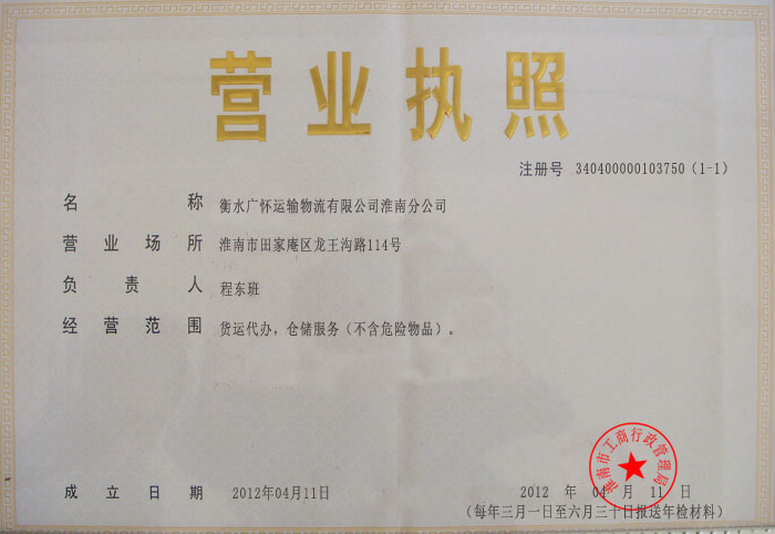 衡水广怀运输物流有限公司淮南分公司营业执照(副本)